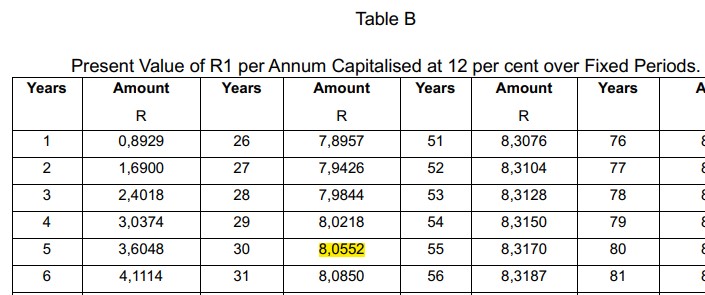 To quote the SARS Transfer Duty Guide: "Where a person acquires a real right for a fixed period, Table B titled “Present Value of R1 per Annum Capitalised at 12 per cent over Fixed Periods” is used to calculate the value. Table B is commonly referred to as the “fixed period tables”;"In this usufruct example let's assume that a certain Mr Joe Soap sells a house belonging to him to his Trust for R5,000,000 but Joe retains an usufruct for 30 years (ie it's a fixed period usufruct, this detail is important when deciding which table in the SARS guide must be looked up). The formula according to SARS to estimate the usufruct's value is: